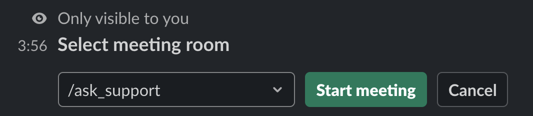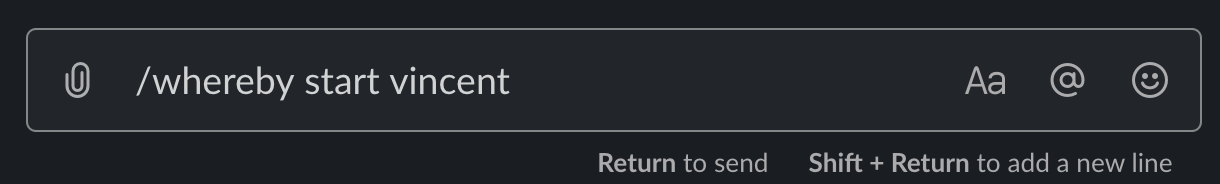 You can type "/whereby" to open up a dropdown menu, where you can select a room that's in your account. Click Start meeting to send a join option to everyone in the room!