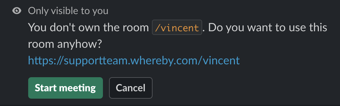 You can type "/whereby start [room-name]" if you want to start a meeting in a specific room.